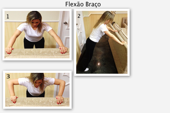 2ème mouvement – Flexion des bras – Restez derrière le canapé et appuyez-vous sur lui, les mains ouvertes sur la largeur des épaules. Placez vos pieds plus en arrière, restant avec votre corps incliné vers l’avant. Contractez l’abdomen et ne laissez pas que votre « arrière-train» reste cambré, forçant votre colonne lombaire. Gardez le dos droit. Pliez vos bras vers le haut jusqu’à approcher votre visage du sofa et revenez. Répétez le mouvement 20 fois. (Si c’était vraiment facile, faites la même chose sur un angle inférieur, sur le bras du canapé.)