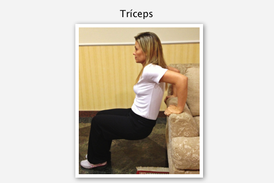4ème mouvement: Triceps – Restez dos tourné au bras du canapé, appuyez vos mains sur lui et pliez les bras et les jambes, comme si vous étiez assise sur un tabouret. Étirez vos bras et fléchissez-les, sans forcer avec les jambes et en gardant le dos droit et l’abdomen contracté. Répétez 15 fois le mouvement.