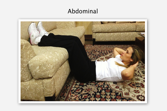 5ème mouvement: Abdominal – Allongez-vous sur le sol (sur un tapis, une serviette ou un petit matelas) et appuyez les deux jambes sur le canapé, formant un angle de 90°. Placez vos mains derrière la tête, soulevez votre torse en avant (sans bouger le cou et le dos, sans toucher le sol). Répétez 30 fois le mouvement. (Si vous avez des douleurs au dos ou au cou, relevez seulement la poitrine et restez dans cette position pendant 20 secondes, sans avoir à monter et à descendre. Si votre canapé est trop élevé, ce qui entrave le repose-jambes, mettez vos pieds sur le sol avec vos jambes fléchis et les pieds coincés sous le canapé.