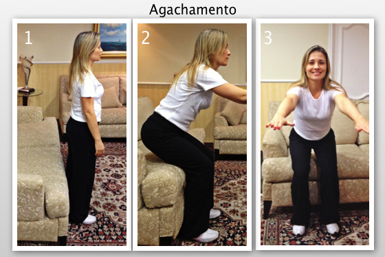 1er mouvement – Debout devant le canapé, faites le mouvement de vous asseoir, mais ne touchez pas le siège et levez-vous à nouveau. Le mouvement doit se faire lentement, avec l’abdomen contracté et le dos droit. En vous baissant, ne laissez pas vos genoux dépasser la ligne de vos pieds. Pour avoir un meilleur équilibre, restez avec les bras étendus en avant. Répétez 20 fois le mouvement.